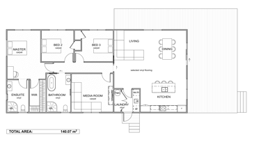 Horizon 140 offers a generous and well considered layout with an added media room that enhances how the home can be used, from family movies to a quiet extra living space. The master suite features a private ensuite and walk in robe, while the remaining bedrooms share a centrally located bathroom for everyday convenience. A large open plan kitchen, dining and living area brings the home together. With outdoor entertainment possibilities, this design blends comfort, flexibility and smart planning across a spacious footprint.